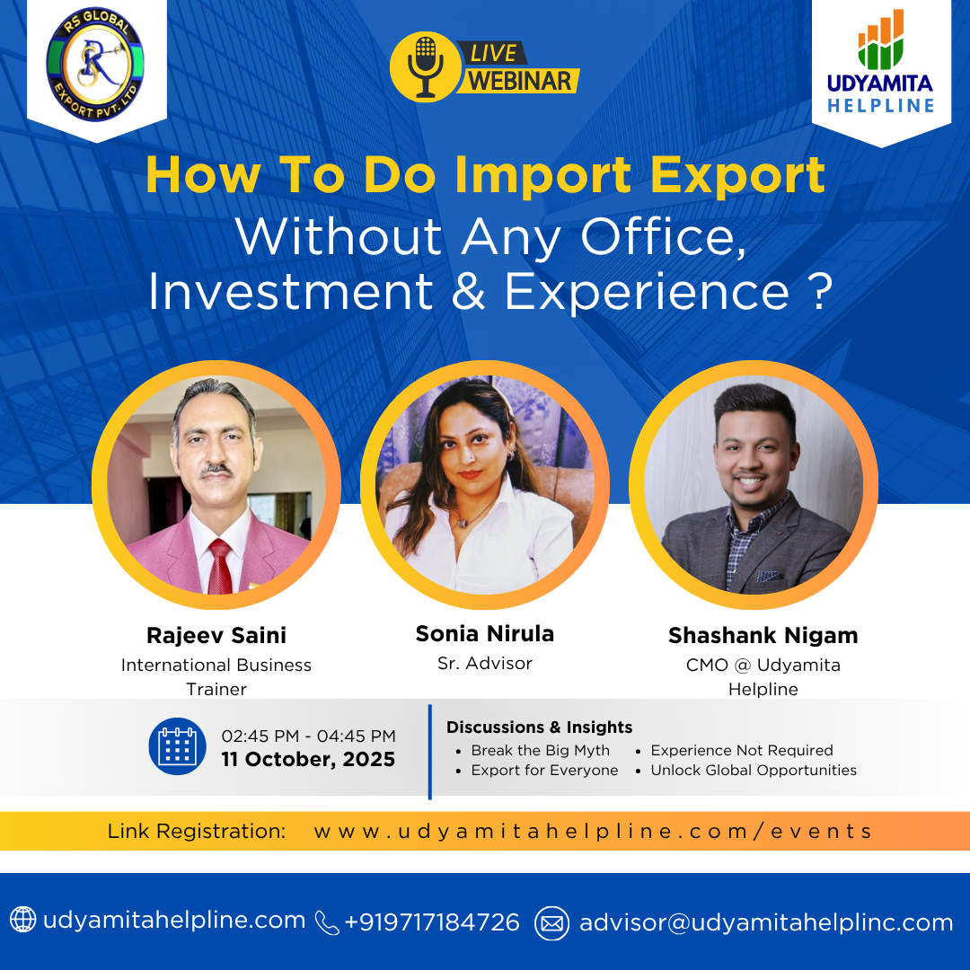 Date: 11th October, 2025 Timings: 02:45 PM TO 4:45 PM UDYAMITA HELPLINE, with a view to educate MSMEs on a large scale and to provide effective measures to their problems, is organizing a webinar on “How To Do Import Export Business Without Any Office, Investment & Experience” on October 11th, 2025. 90% OF PEOPLE THINK IMPORT/EXPORT BUSINESS IS RISKY, HUGE INVESTMENT,
