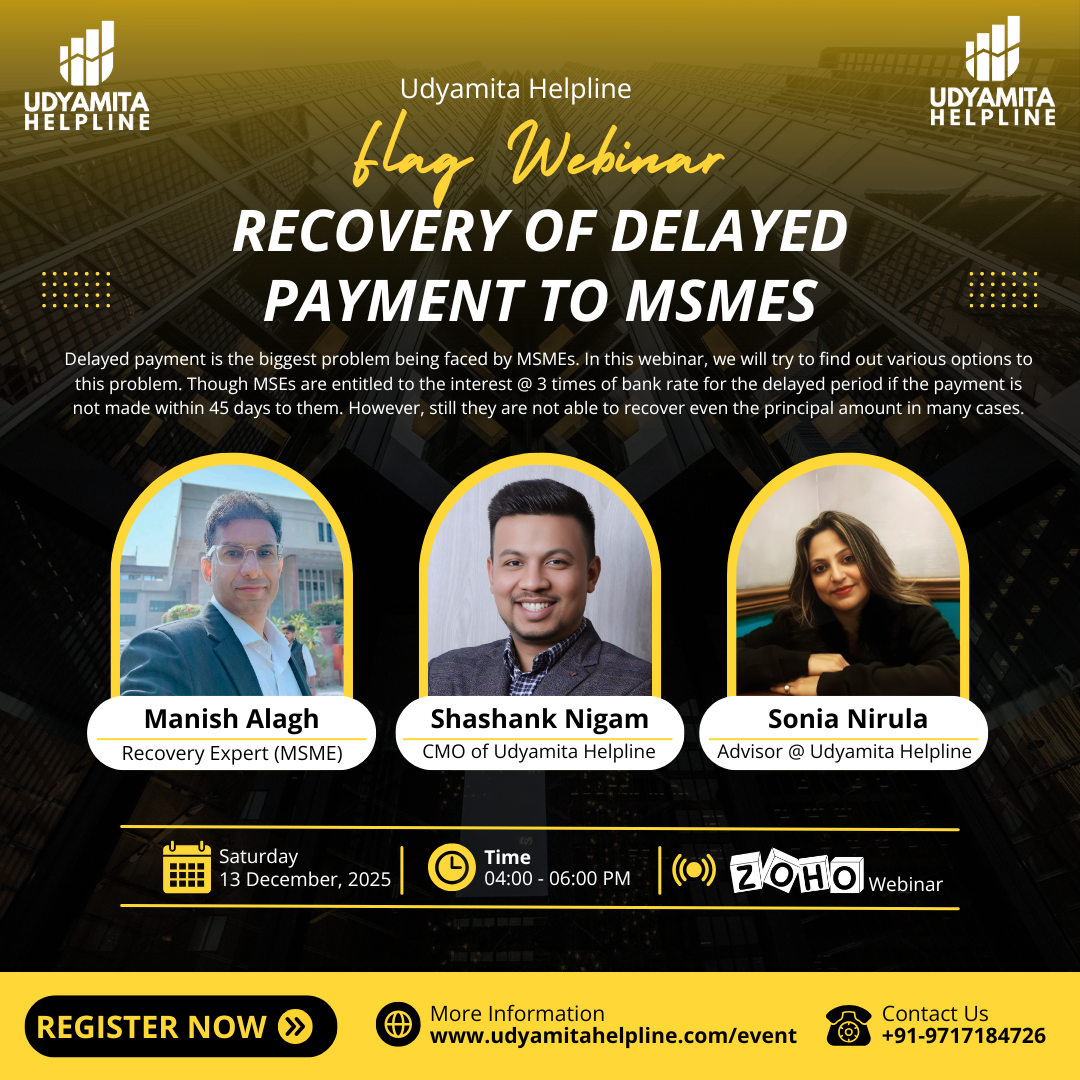 Date: 13th December, 2025 Timings: 04:00 PM TO 6:00 PM UDYAMITA HELPLINE, with a view to educate MSMEs on a large scale and to provide effective measures to their problems, is organizing a Webinar on “Recovery of Delayed Payment To MSMEs” on December 13th, 2025. Delayed payment is the biggest problem being faced by MSMEs. In this webinar, we will try to find out various options
