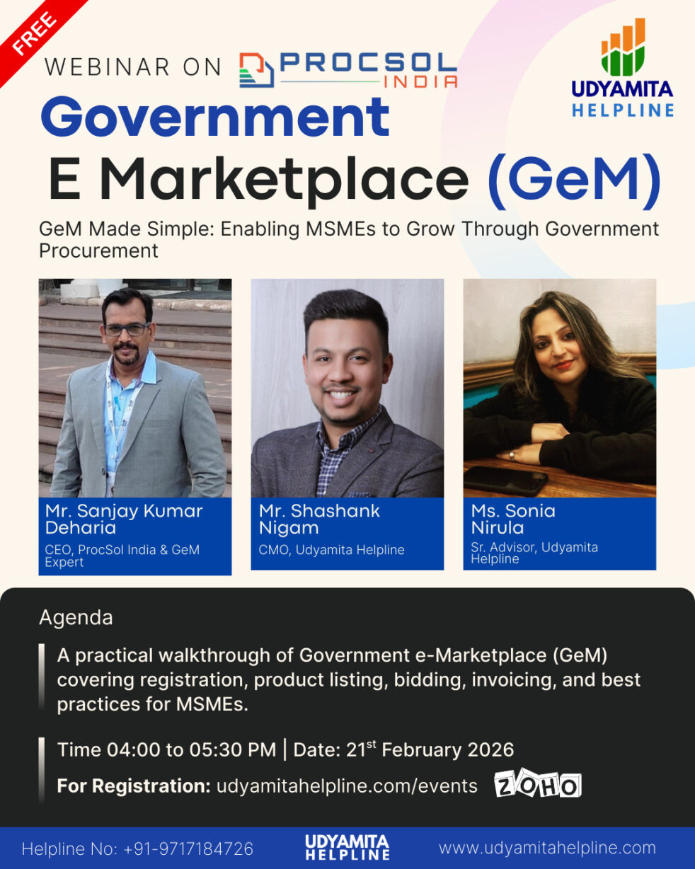 Date: 21st February, 2026 Timings: 04:00 PM TO 5:30PM UDYAMITA HELPLINE, with a view to educate MSMEs on a large scale and to provide effective measures to their problems, is organizing a "Webinar on “Government E Marketplace (GeM)” on February 21st, 2026. GeM portal (Government e-Marketplace) is an online portal launched by the Government of India The main aim of introducing